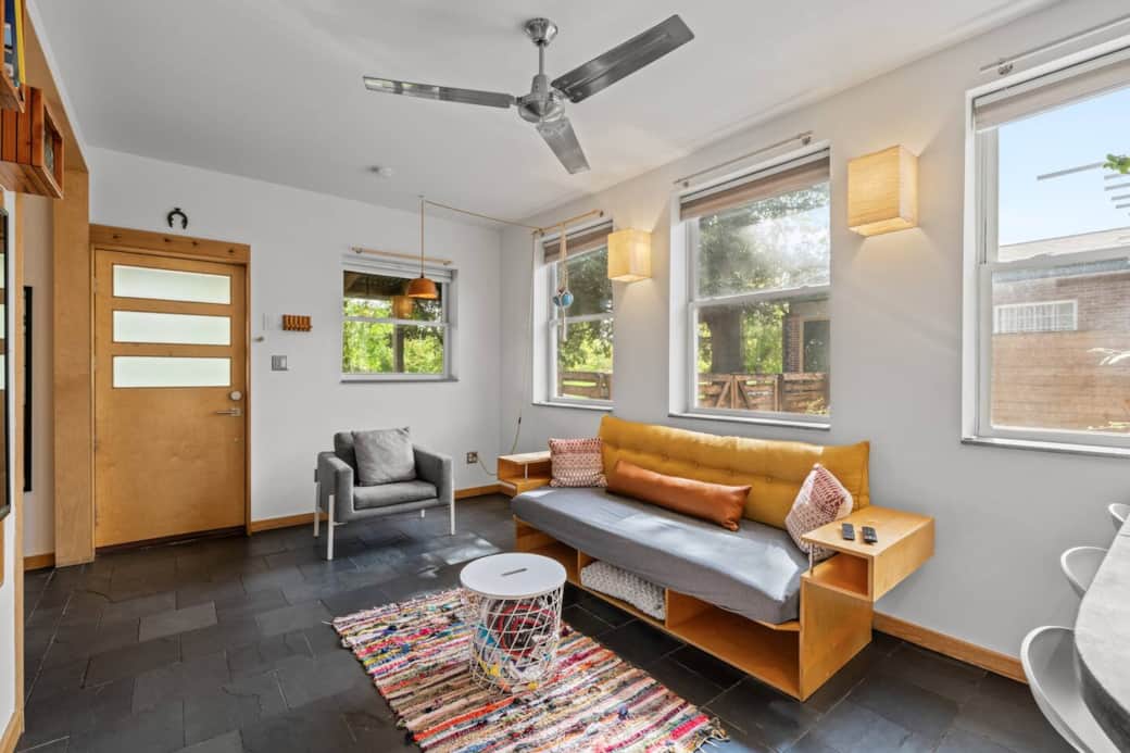 The main living space is bright and inviting, with radiant slate floors and large south-facing windows that open the room to the back patio and garden. Additional windows look toward the park, creating a continuous sense of light and openness.